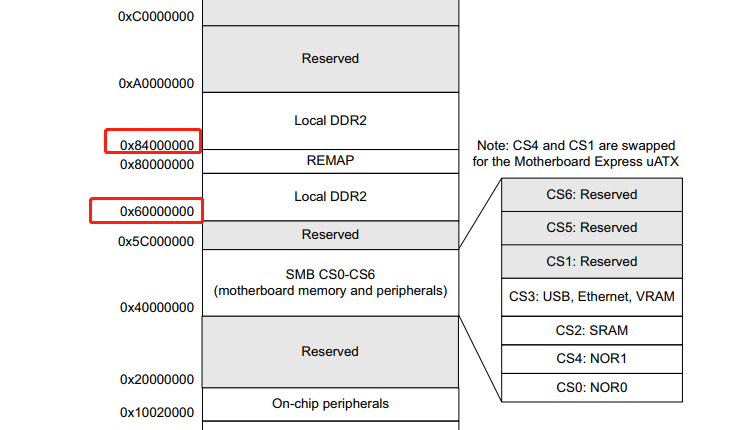 可以看到物理RAM对应的地址有两个一个由 0x6000 0000 ~ 0x8000 0000 第二个域为 0x8400 0000 ~ 0xA000 0000